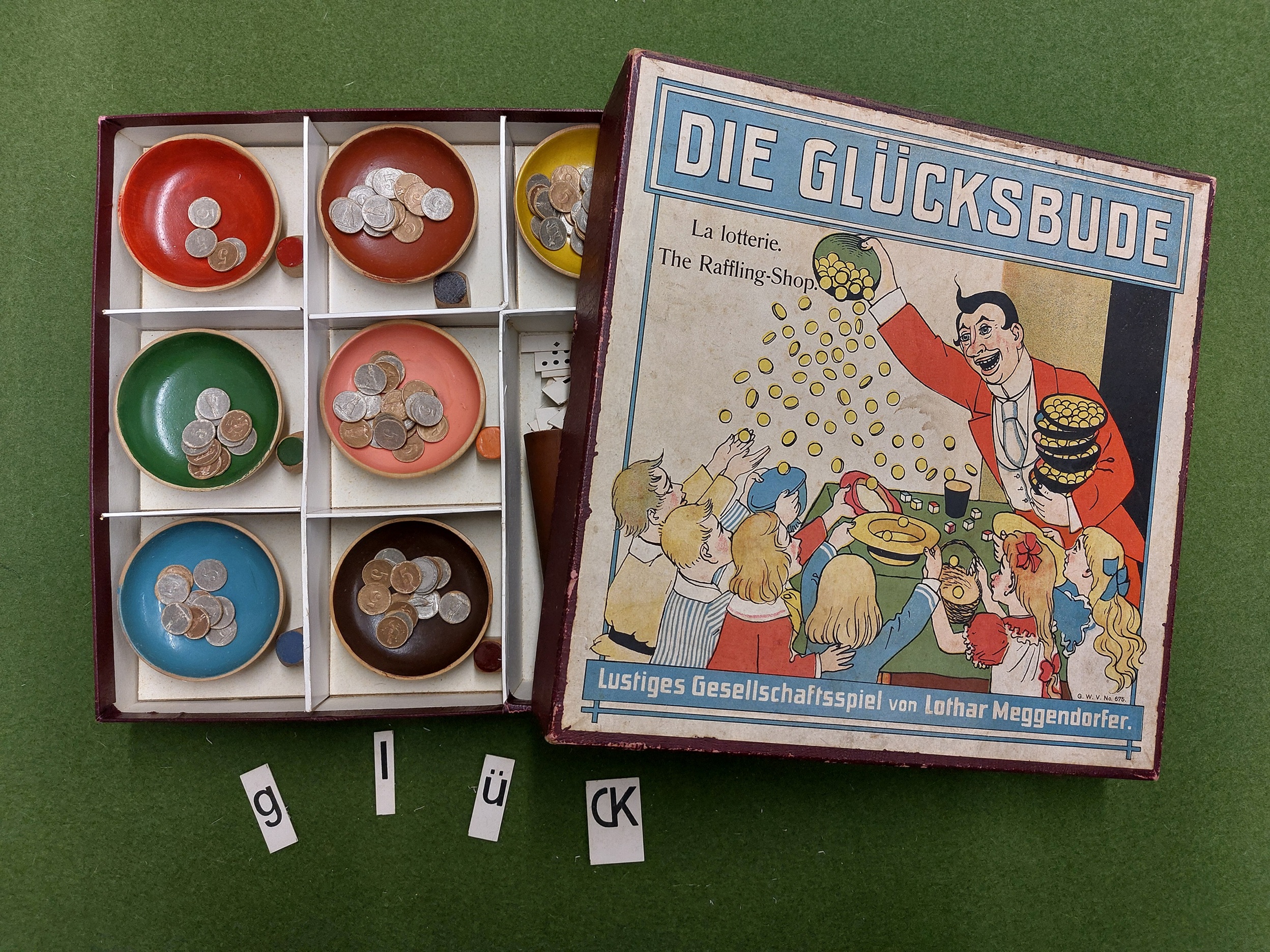 Im Dachgeschoss der felto – Filzwelt hält eine neue Sonderausstellung Einzug: Bunte Würfel, glänzende Spielmünzen und schillernde Jetons, fantasievolle Spielpläne und Kartensets – eine große Bandbreite historischer Gesellschaftsspiele und -requisiten aus der Zeit zwischen 1750 und 1950 ist in den Vitrinen zu bestaunen. Ob „Fang den Hut“ oder „Glocke und Hammer“, „Poch“ oder Lottospiele – sie alle funktionieren nach dem Glücksprinzip und zeigen, wie sehr sich das Spiel mit dem Zufall im Laufe der Jahrhunderte gewandelt hat. Die ausgestellten Objekte stammen aus der bedeutenden Spielesammlung von Dieter Mensenkamp (Detmold), der schon seit langer Zeit eng mit der Stiftung Spiel und dem Spielmuseum verbunden ist.